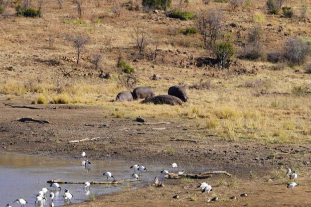 池の周りではカバの家族がお昼寝中。