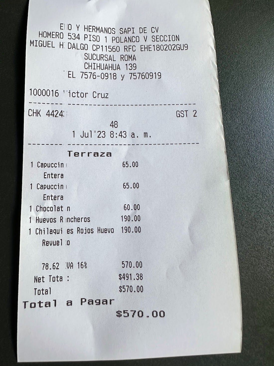 例えばこちらが具体的な朝食の例。ローマノルテ地区にあるカフェで朝ごはんをいただきましたが、カプチーノはUSD3.81、クロワッサンはUSD3.52、朝食は約USD11です。感覚的にサンフランシスコの30%安いイメージです。