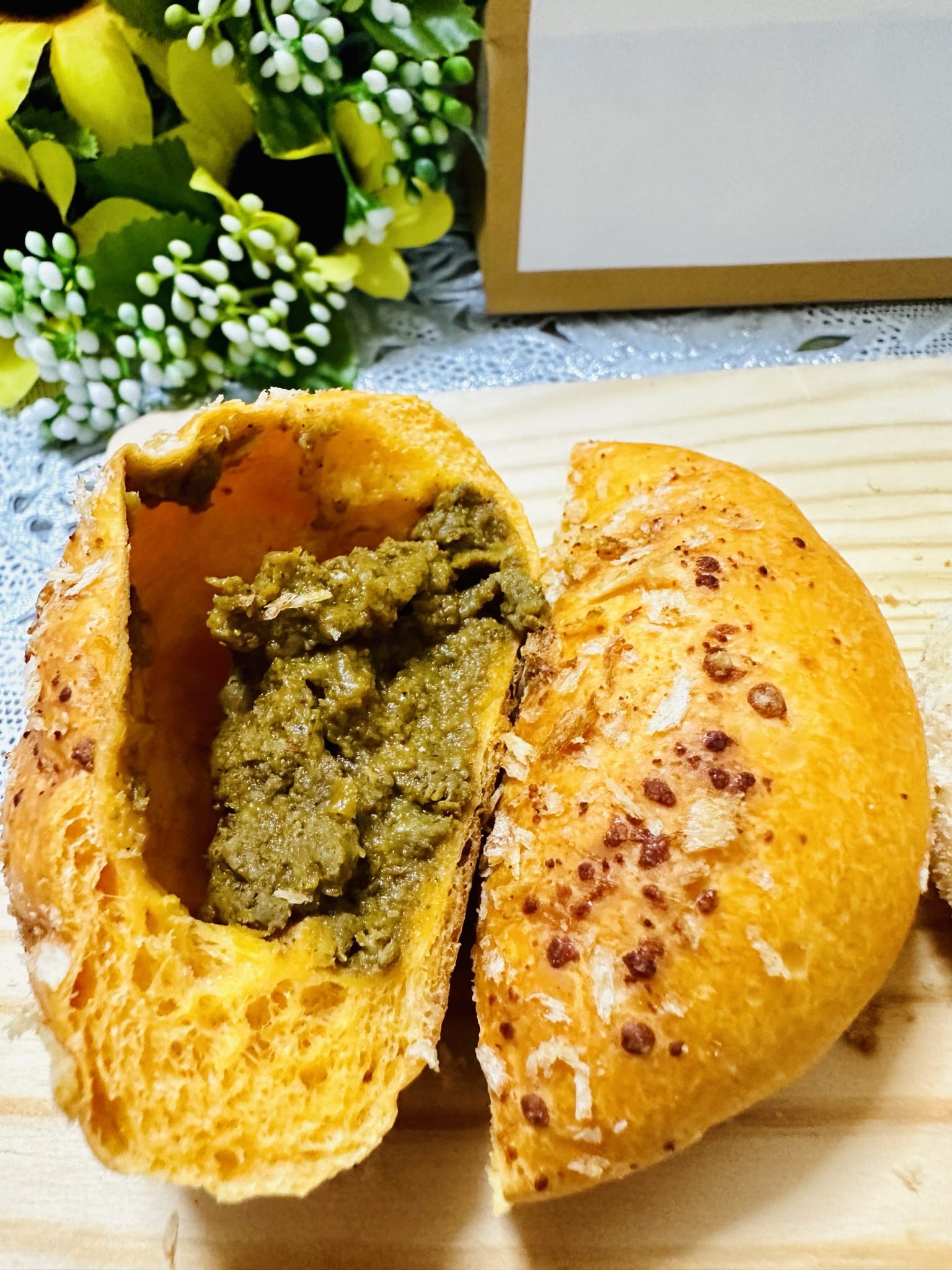こちらはテイクアウトし、自宅でカットしています。生地にトマトジュースを練りこみ、もっちりとしたパン生地に、後引く辛さの、牛ミンチカレーが、たっぷり入り、刺激的!チーズの香りもたまりません。