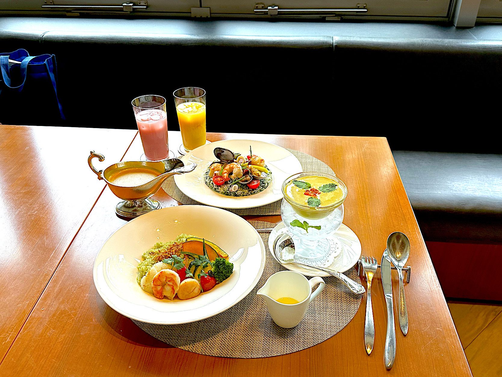 帝国ホテル初!冷製カレーです。玉ねぎやトマトなどの野菜をココナッツミルクやチキンブイヨンで煮こんでいます。バジル香るジャスミンライスの上には、温かい野菜とシーフードがのっています。