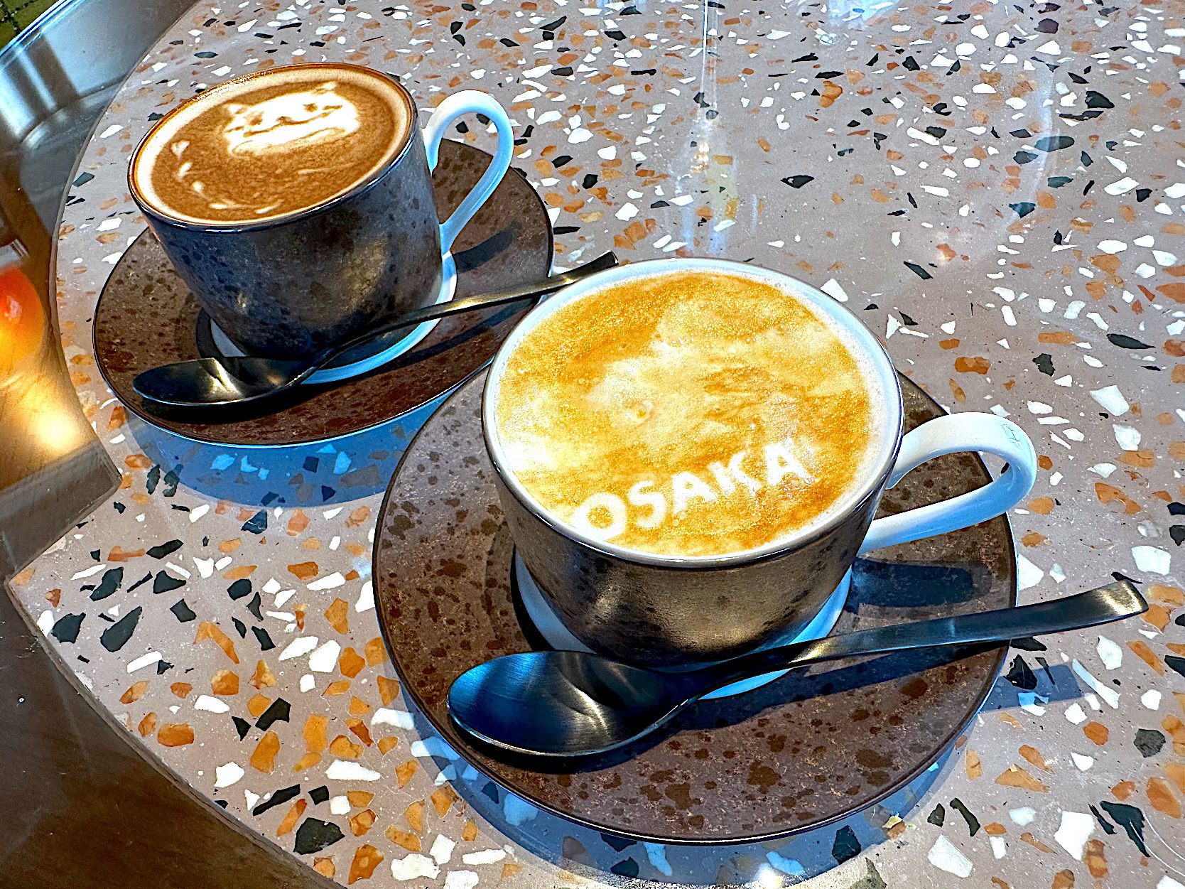カフェラテも楽しませてくれます。上は女性スタッフオリジナルの絵、下はうっすら大阪城です。希望の絵を描いてくれます。ご希望の方はご確認下さい。