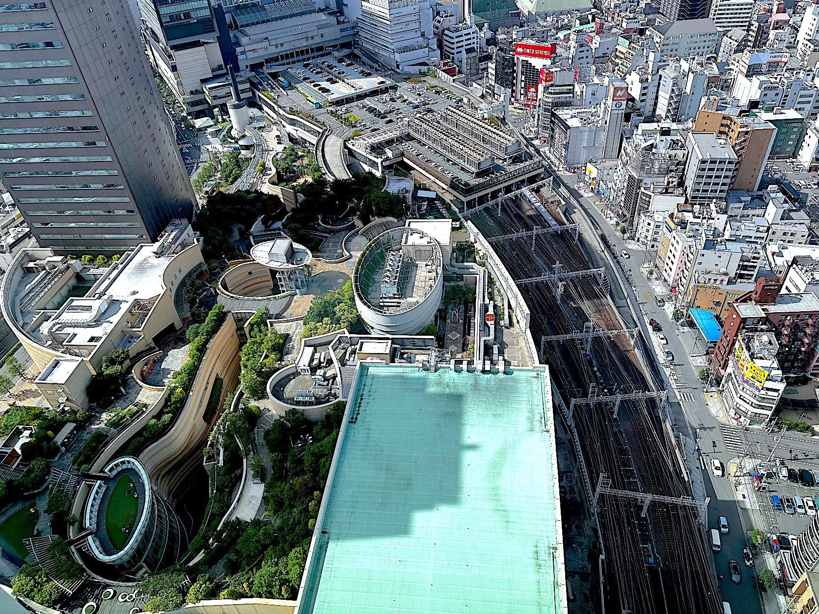 大阪市街が見渡せる店内。特に筆者のお気に入りは、なんばパークスの全容を上空から見れる事と、南海なんば駅を発車する列車を見る事。列車好きはかなり楽しめます。