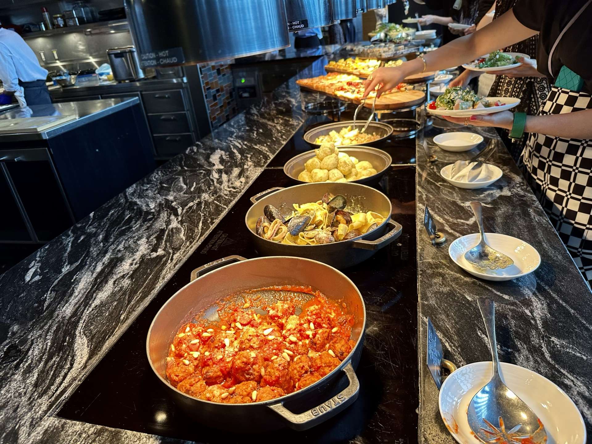 オープンキッチンで、シェフ達の様子もライブ感さながらに楽しめます。開放的な店内で、朝食からランチ、スイーツ、ディナーと1日を通し、様々なビュッフェが楽しめます。