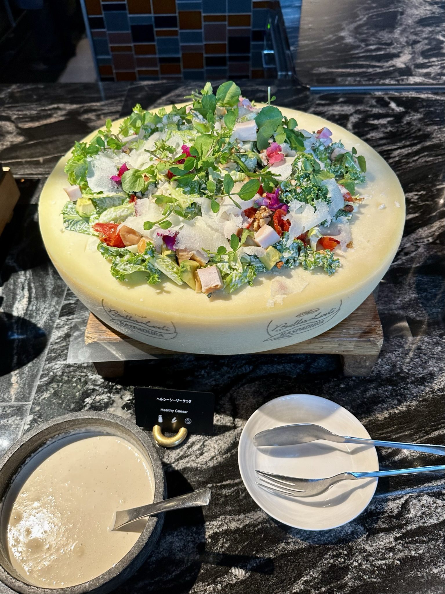 鮮やかなサラダがのっているプレートが驚きのチーズ。爽やかでシャキシャキ。ドレッシングとの相性抜群。