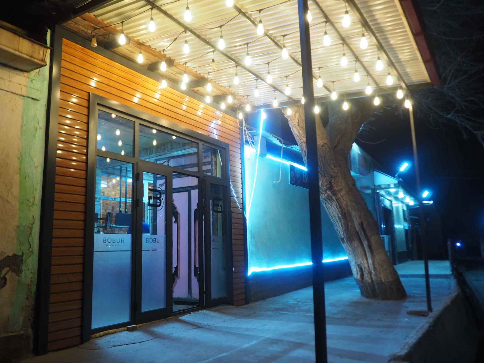 こちらがお店の入口。ドアのところにBOBUR SHASHLIK(ボーブル・シャシリク)と書かれています。夜は明かりでキラキラしているのですぐ分かるでしょう。