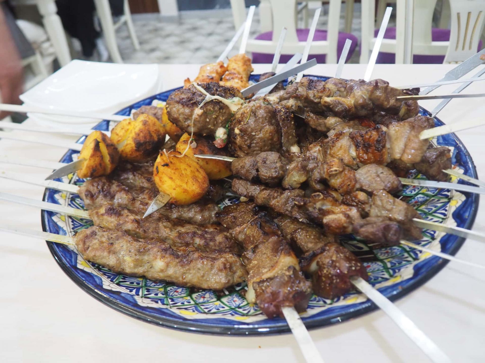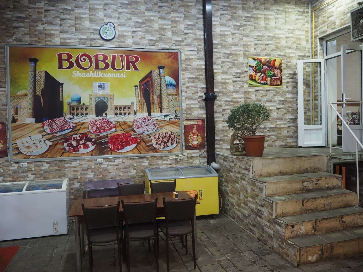 レギスタン広場などの観光地が集中している、サマルカンドの旧市街エリア。安宿も無数にあり、多くの旅行者がこのエリアに滞在していますが、カフェや軽食堂は多いものの、お酒が楽しめる、かつ地元の人もよく行く安めのローカルなレストランとなるとかなり限られます。このような食堂をご所望の方にまず私がおすすめしているのが、今回ご紹介するシャシリク(串焼肉)のお店、カフェ・ボーブル。先述の条件をすべて満たしてくれる、貴重な貴重なお店です。