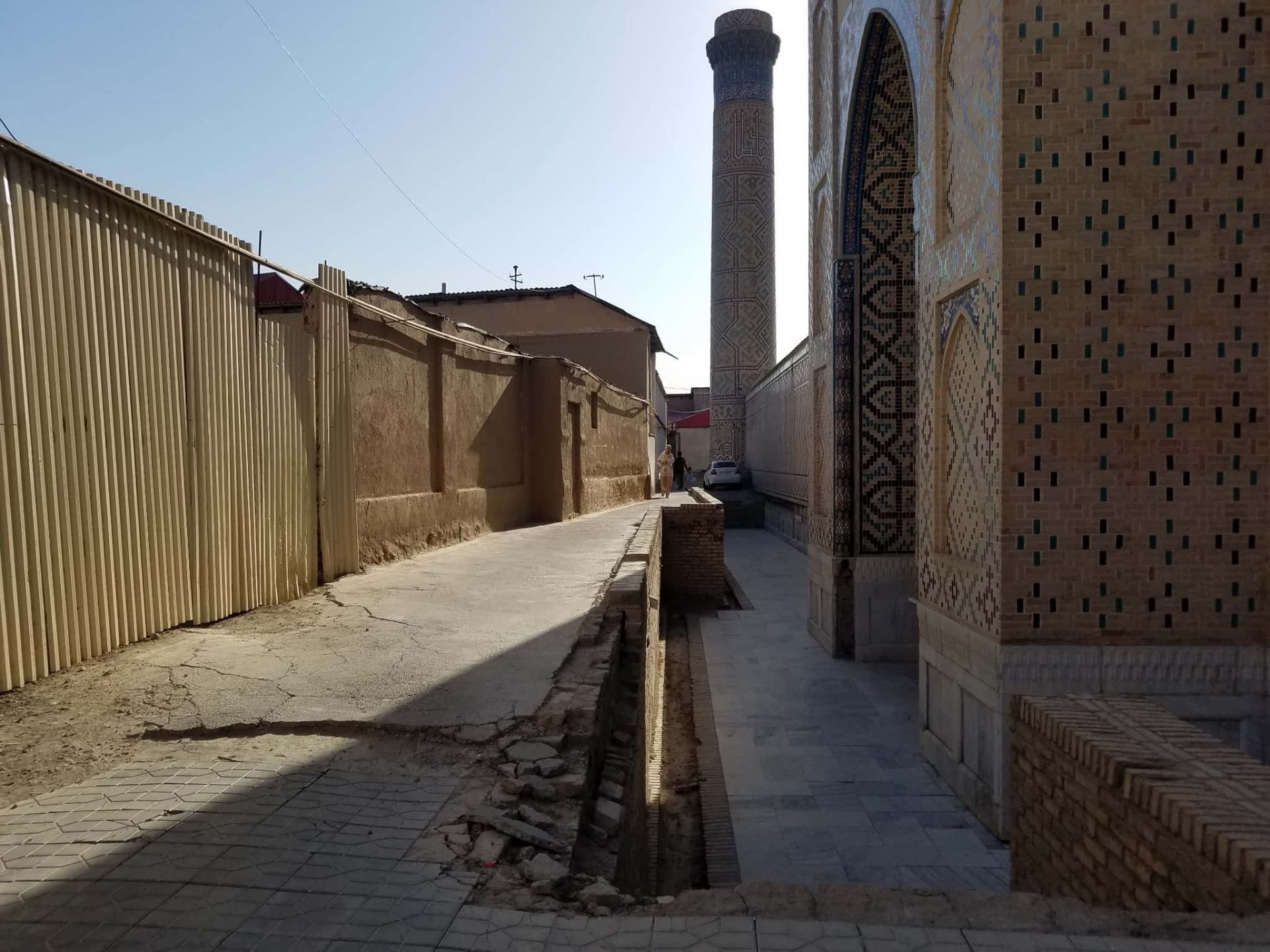 お店があるのはランドマークのビビハニム・モスクの真裏。歩行者天国のカリモフ通り(タシケント通り)からだと、モスクのすぐ南のこの路地を通って向かうことになります。道から落ちたらちょっと危ない高さなので、この店でしこたま飲んで酔っ払った際は帰り道にここでよろけないよう気を付けて…。