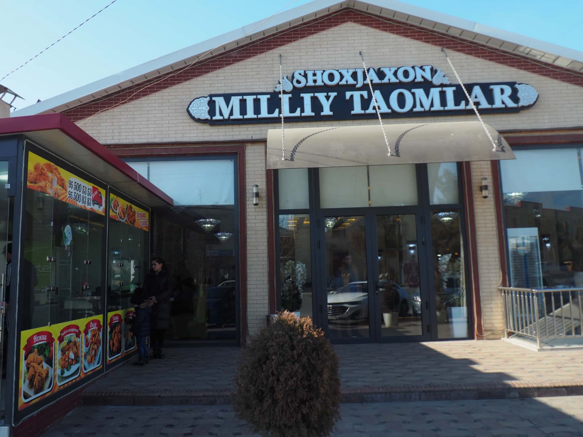 でもご心配なく。ガイドブックには載っていないものの、立地もそこそこよく値段も良心的な筆者イチオシのレストランがあるのです。その名は「ショフジャホン・ミッリー・タオムラル(Shoxjahon Milliy Taomlar)」。ウズベク料理の食堂でよく見るミッリー・タオムラルという表記は、ウズベク語で民族料理や伝統料理という意味。ついでにショフジャホンは世界の王という、なかなかスケールのデカい店名です。