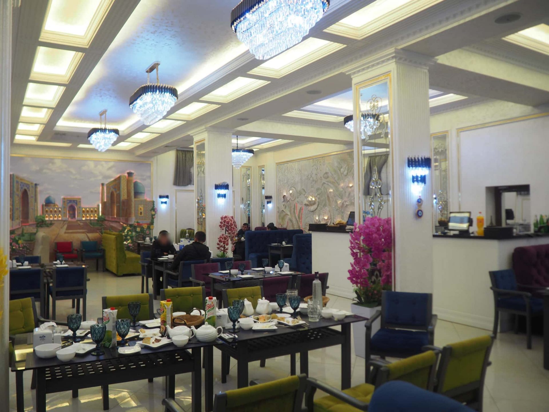店内はそれなりに広く、いかにもウズベク人が好きそうなギラギラ系の内装。といっても大規模なレストランでありがちな、会話が難しいほどのズンチャカ系爆音を聞くことはありません。暑い時期は屋外席で食べることもできます。