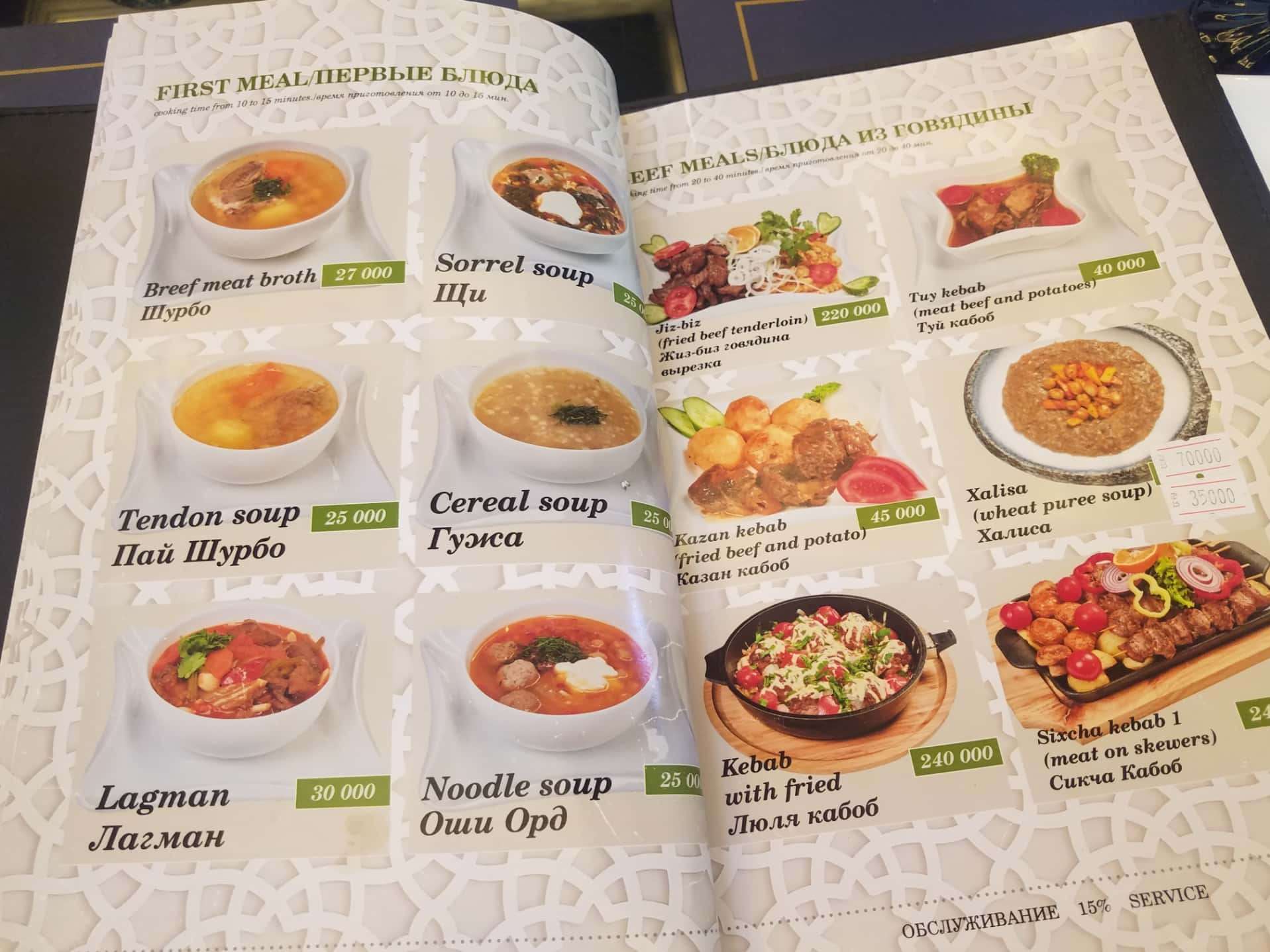 メニューは英語付きなので安心。何といってもこのお店のメリットは料理の種類が多いこと。何とサラダだけでも20種類以上あるのです!シャシリクやカザンケバブ(肉とジャガイモを蒸し焼きにした料理)、タバカ(骨付き鶏)、揚げ魚とメインもよりどりみどり。人気料理のラグマンやショルバももちろんあります。大勢で行くならいろんなウズベク料理を少しずつ頼んで食べ比べてみましょう。