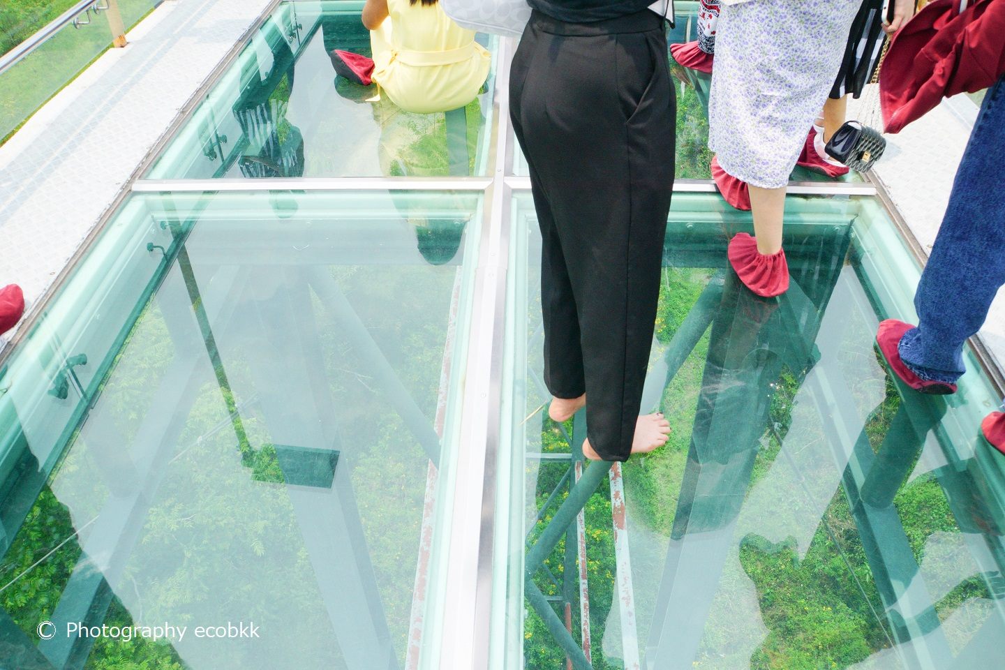 4月と言えばタイで最も暑い夏季。裸足でガラスの上を歩くのは大変暑く、歩けないくらいで、また、ガラスに傷をつけないよう、専用の大きな靴下のようなものが配布されており、利用できました。