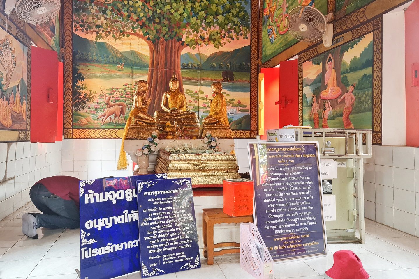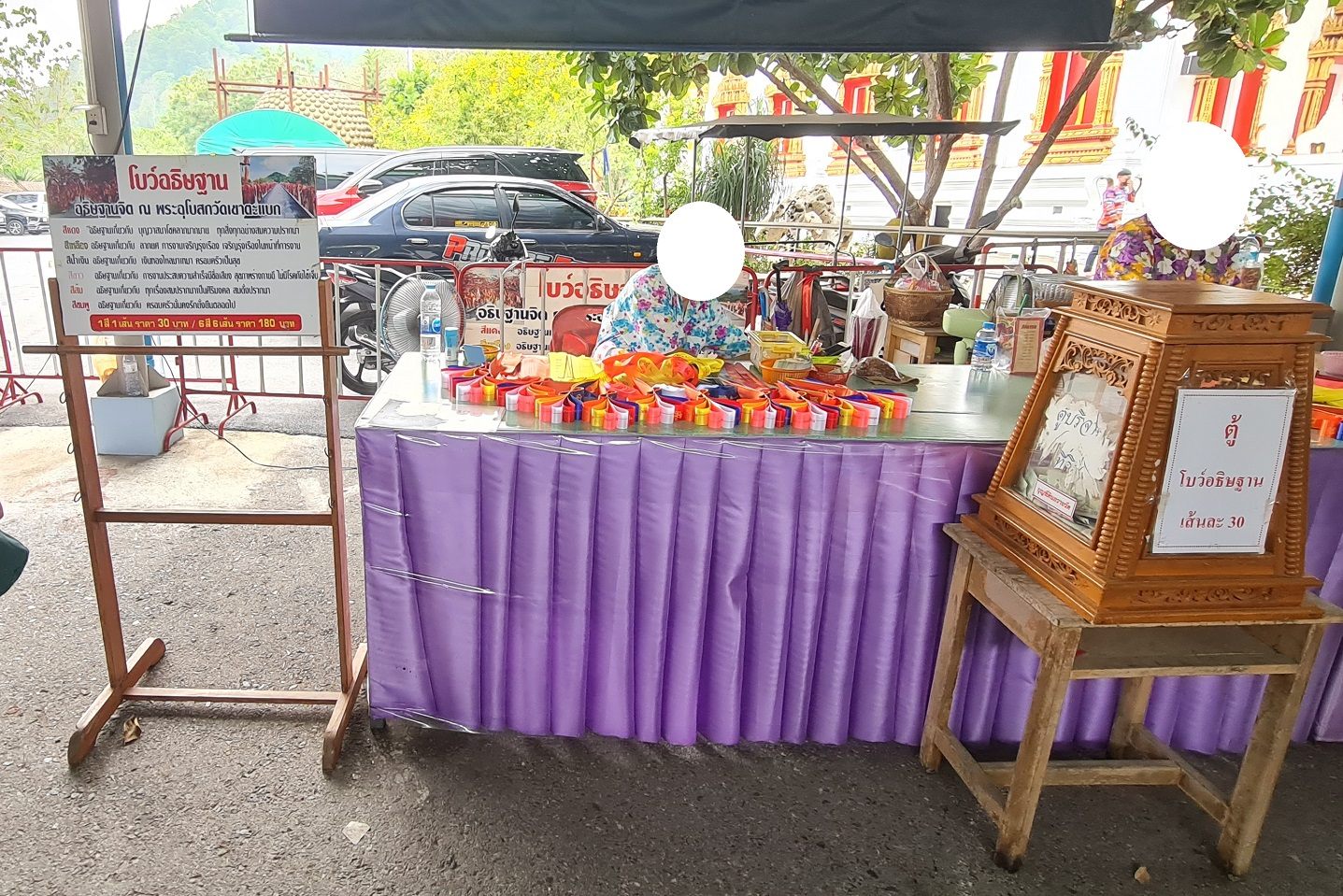 寺院の下のほうで、お線香やリボン等の参拝セットを購入することができます。お線香の包みには、ロウソクと金箔が入っています。金箔は、入口近くにある像に貼るようです。リボンは、柱や木に巻くことで色毎の願い事が叶うとされています。リボンは6色あり、1色につき、30バーツです。