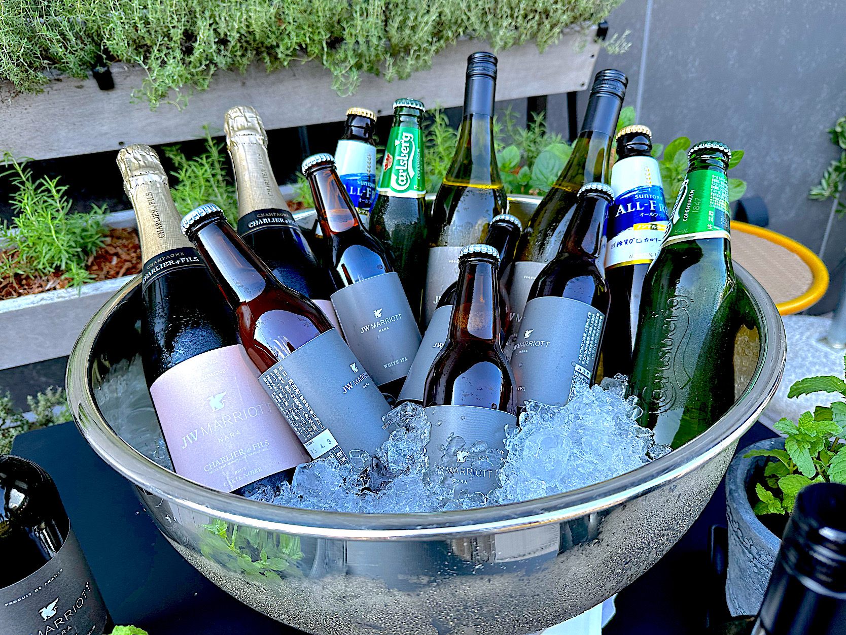今年のビアガーデン新登場の、ホテルオリジナルクラフトビールIPAはじめ、ワイン、ウィスキー、カクテル、ソフトドリンクなど、20種のフリーフローが楽しめます。Aコースはシャンパーニュが付きます。