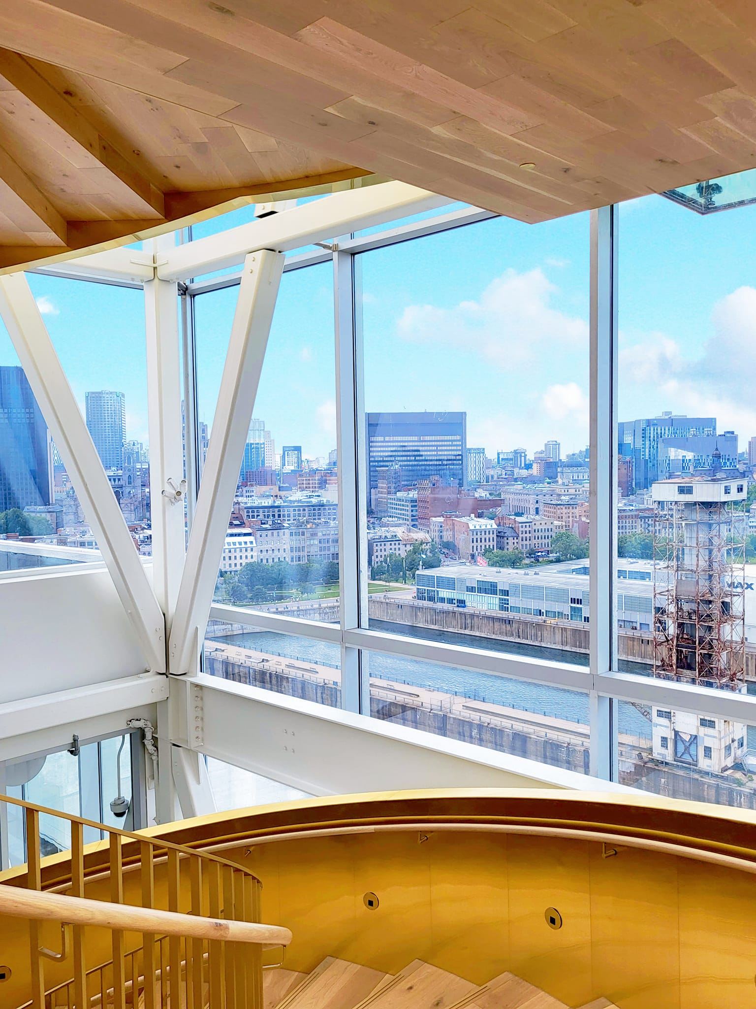 展望室のある13階から金色のホワイトオークのらせん階段を15階まで上がると、360度見渡せる展望ルームに到着する。