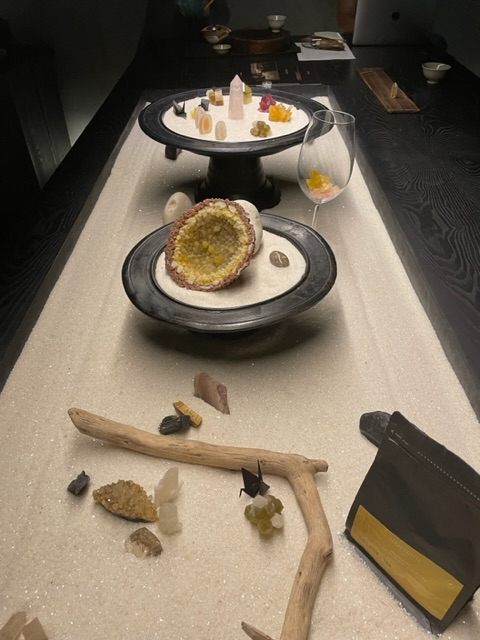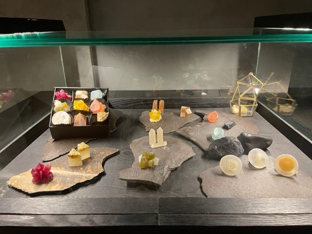 中央には、宝石の原石をそのまま精巧に再現した「琥珀糖」が、凛とした美しい設えで展示されています。