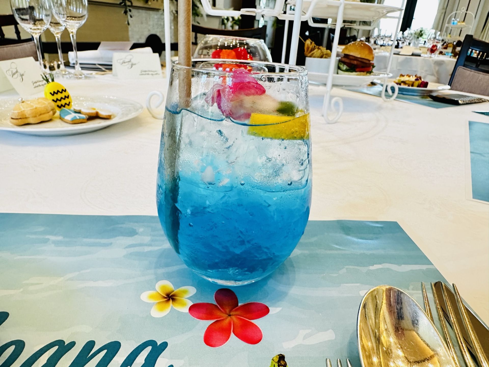 スペシャルウェルカムドリンクは、”きらりんシュワッとポップソーダ”です。“海”を感じる爽やかさで、しゅわっと口いっぱいに炭酸が広がるソーダドリンク、下にはゼリーが入っています。