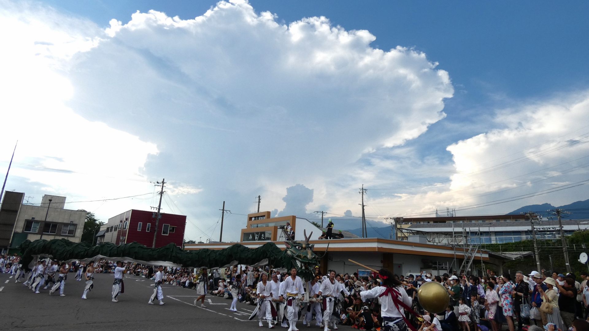 ラピュタに出てくる龍の巣のような雲の元、大迫力のお祭りでした。毎年最終土曜日開催です。是非、来年は実際に見てください。それと、龍神まつりに参加するには傘をお忘れずに。