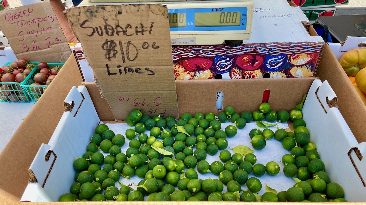 そーか、スダチ(SUDACHI)は、ライムの仲間なのか? まだ時期には早いがファームから持ってきてみたと言う感じ。ウズラの卵より小さいスダチです。もうちょっと大きくなるまで待てなかったのだろうか?と話のたねにひとつかみ買ってみました。絞るの大変でしたが、ふわっと香って口福。やっぱりもうちょっと待った方がいいと判断したか ?15日だけの特別販売でした。