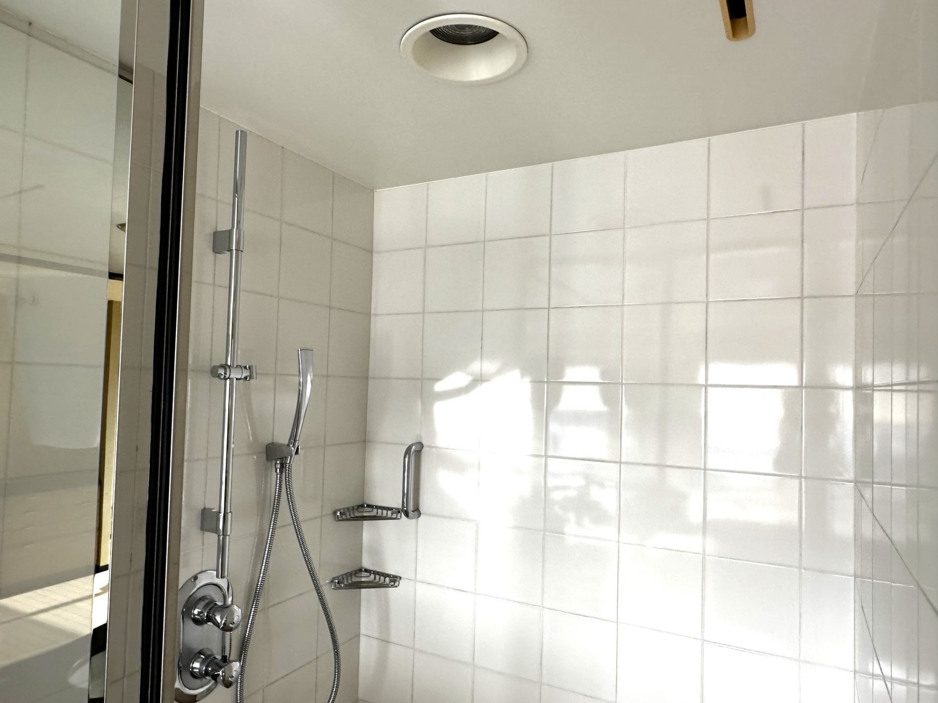 洗面所の横にシャワーブースがあります。シャワーヘッドが可動式なので使いやすいです。