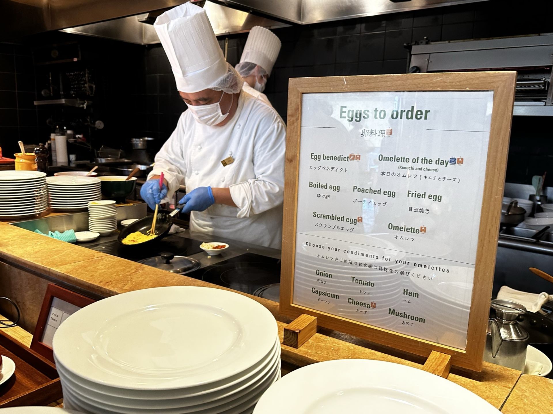朝食は1階「ザ・カフェ」でビュッフェ料理が楽しめます。シェフが目の前で作ってくれる卵料理は人気で、焼き方や、希望の具を言えば焼いてくれます。