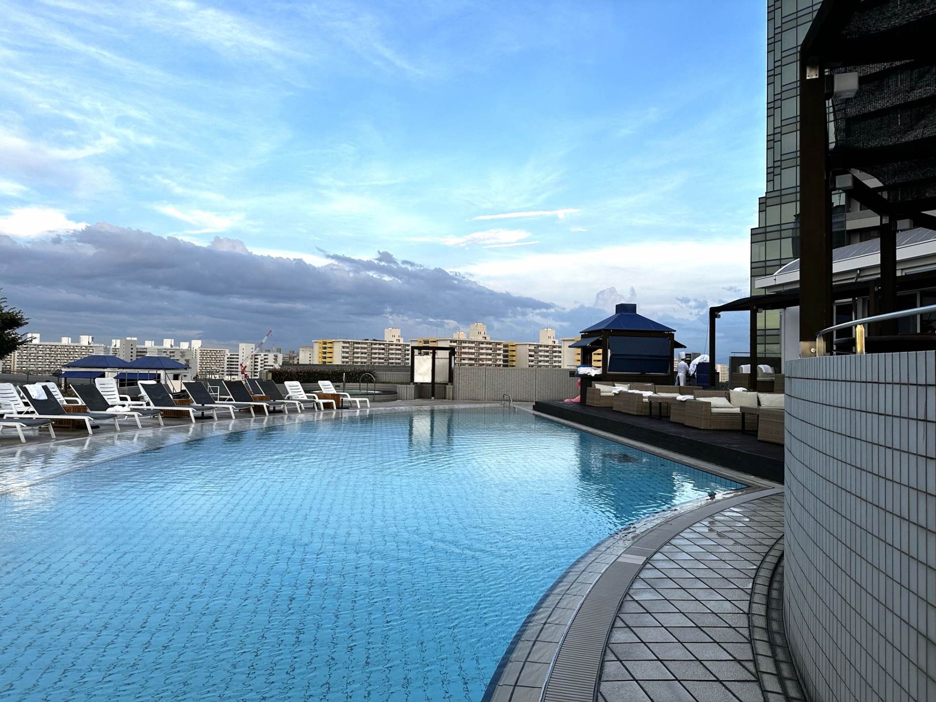 ホテル宴会棟9階・ルーフトップにある、夏季期間のみ楽しめるガーデンプール。心地よい海風が通り抜け、水面が気持ちよさそうに小さく揺れる光景を見ているだけで癒されます。サンデッキで読書や日光浴など、まるで海外リゾートで楽しんでいるような空間です。