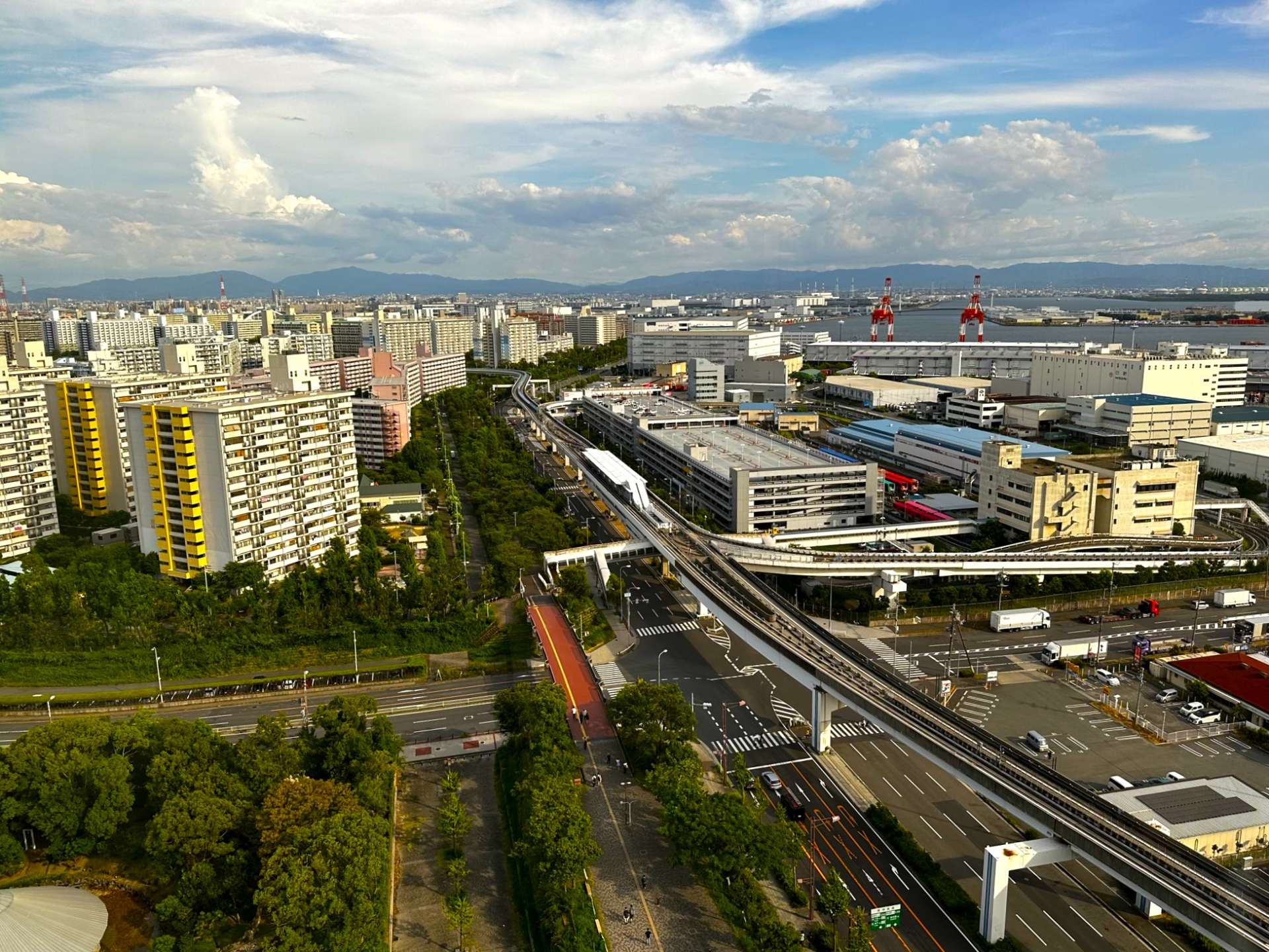 バスタブからは、大阪南港エリアの大型複合施設ATC(アジア太平洋トレードセンター)や、 大阪南港コスモフェリーターミナルに停泊中のフェリー「さんふらわあ」が見えます。