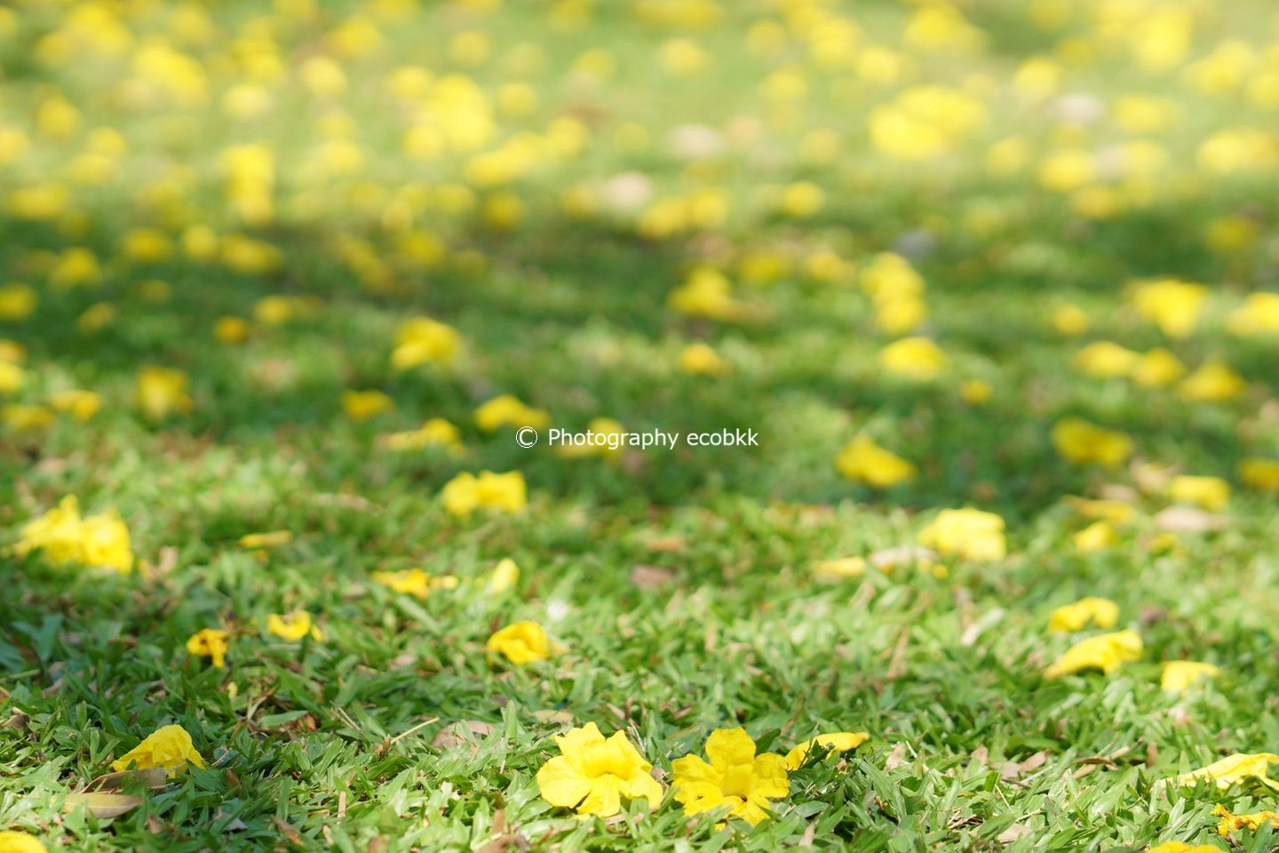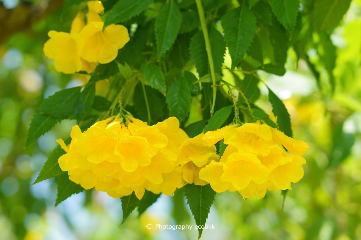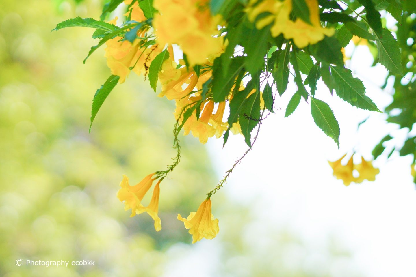 タイの桜がきれいに咲いている時にも見られる花ですが、今回、タイの桜「チョンプーパンティップ」とよく似たトランペットの形をした黄色の花が一部で咲いているのが見られました。こちらの花もいくつか地面に落ちている場所があり、その様子もまたとてもきれいでした。タイ語では、「ทองอุไร(読み方:トーンウライ)」というようです。英語では、「yellow trumpet flower」、和名は「金鈴樹(キンレイジュ)」というお花のようです。バンコクでは、船の形をした寺院「ワット・ヤンナーワー」の敷地内等でも咲いているのをよく目にするお花です。このほかにも、たくさんのお花が開花していました。チャトチャック公園とつながっている鉄道公園のほうまで行くと、ブーケンビリアやタイの国花「ゴールデンシャワー」のお花も見られました。