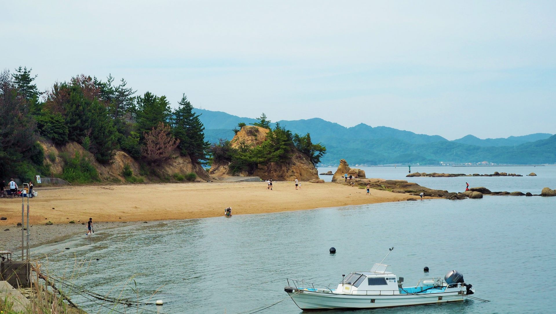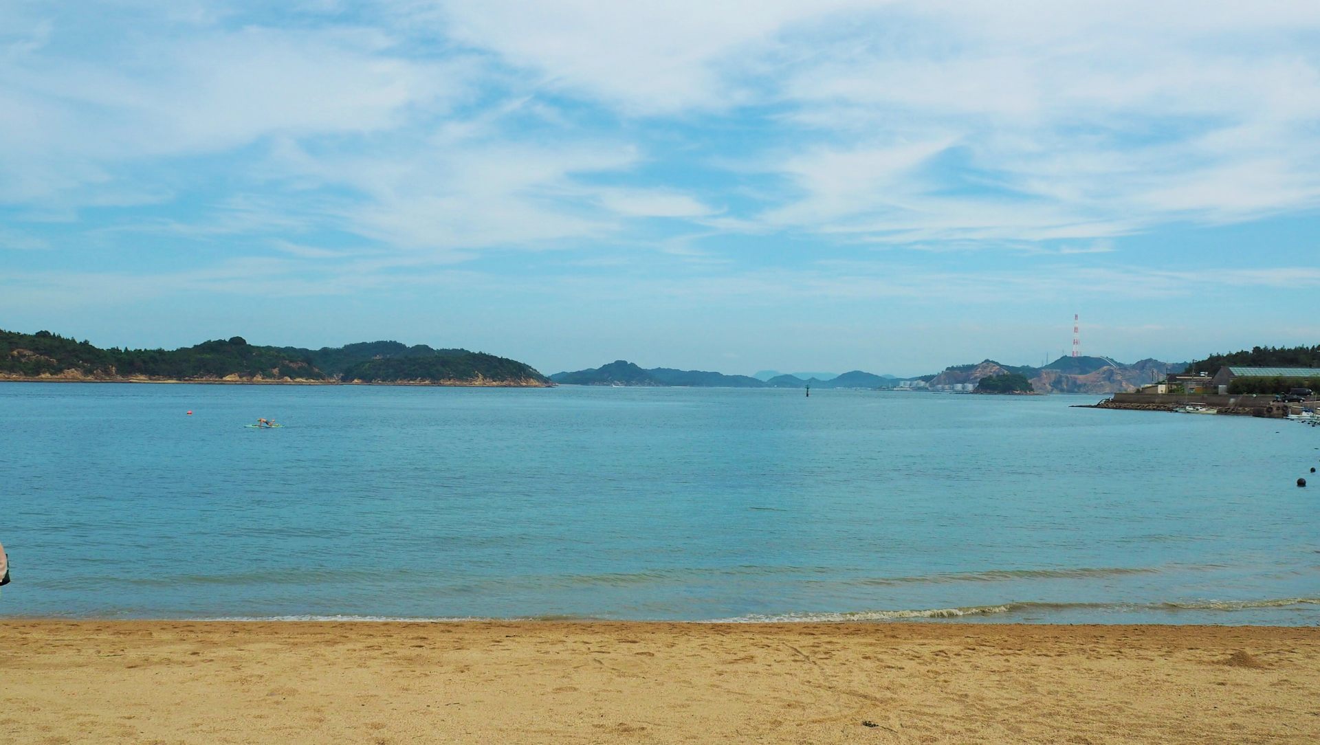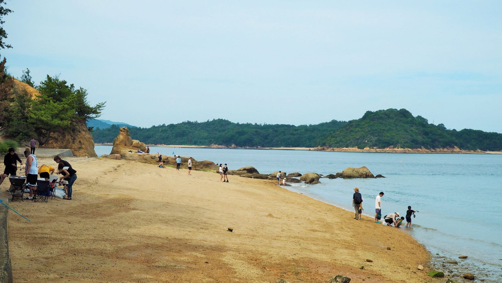 海岸に降りてみます。砂浜があり、渚で水遊びやバーベキュー、釣りなど、思い思いに楽しんでいらっしゃいますね。ただ、遊泳禁止なのが残念です。SUP(サップ)で海上散歩をしている人もいました。対岸に見えるのはおそらく牛ヶ首島です。