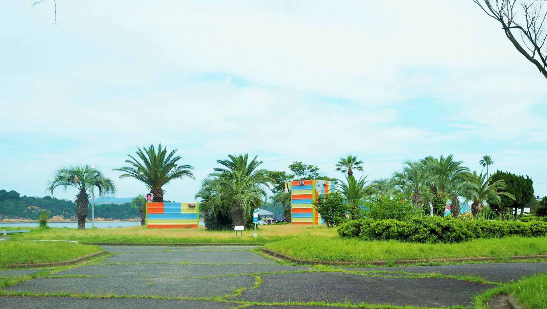 「日の出公園」の駐車場に車は停められます。南国ムード満点の公園には幼児向けの遊具がありました。