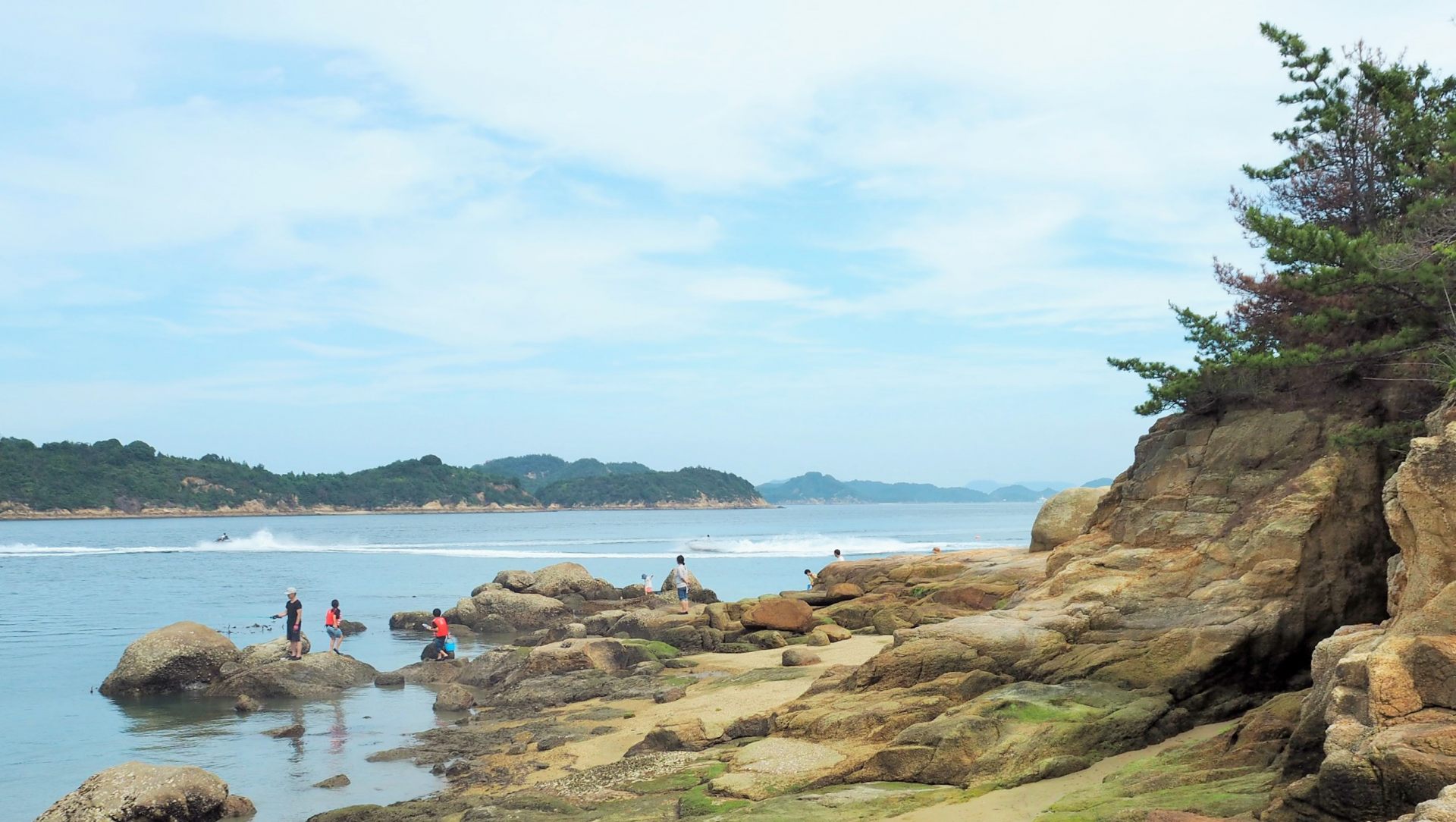 磯では釣りや潮だまりの生き物を捕まえている子ども達の歓声が聞こえてきます。ただ、水上バイクが猛スピードで走り抜けて行きます。これではうかうか泳いでいられませんね。