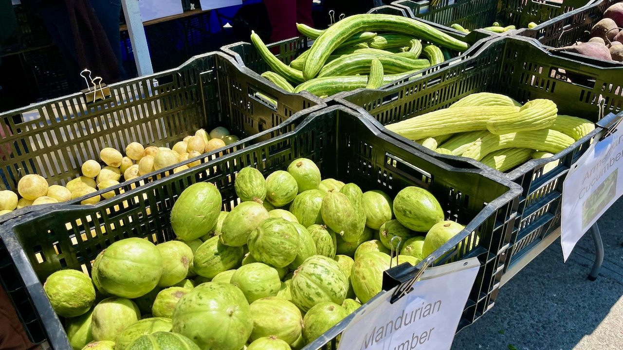 右手前:アメリカンきゅうり、ほぼ白に近い薄緑の皮が珍しい。きゅうりらしからぬ柔らかい食感がびっくりです。