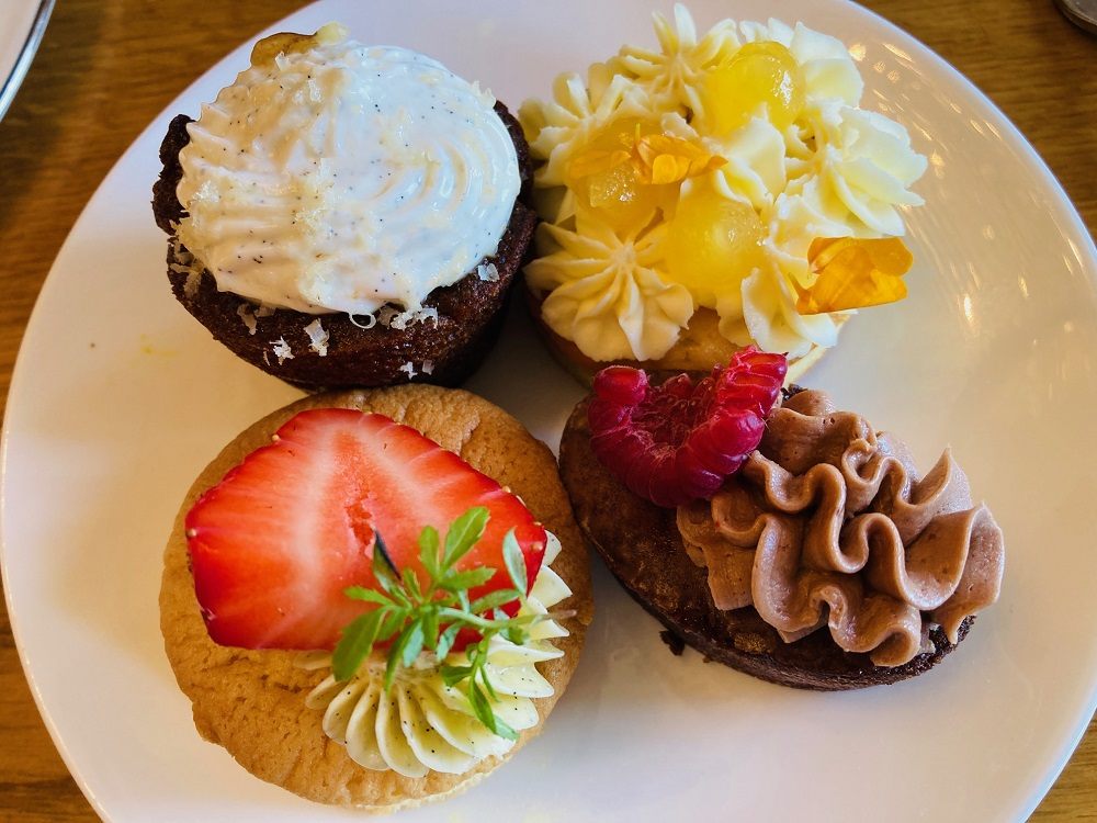 こちらのケーキは可愛らしいプチサイズ。季節によって変わりますが、この日は左上から時計回りにキャロットケーキ、シトラスケーキ、チョコレートのフィナンシェ、苺カップケーキ。どれも軽い口当たりなのが嬉しい!
