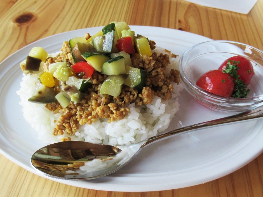 この日は、ドライカレーでした。とってもおいしかった! ソフトな辛さでしっかりスパイシー。夏野菜がゴロゴロ入っていて味わい豊かです。お米は、北杜市のなかでもおいしいと評判の武川米だそうです。