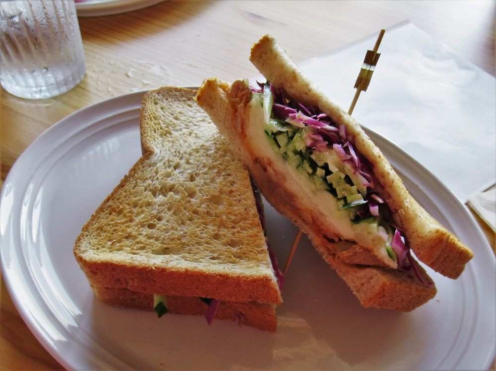 ポークチャップとマッシュポテトのサンドイッチ。BBQソースのポークとポテトの相性が絶妙でした。