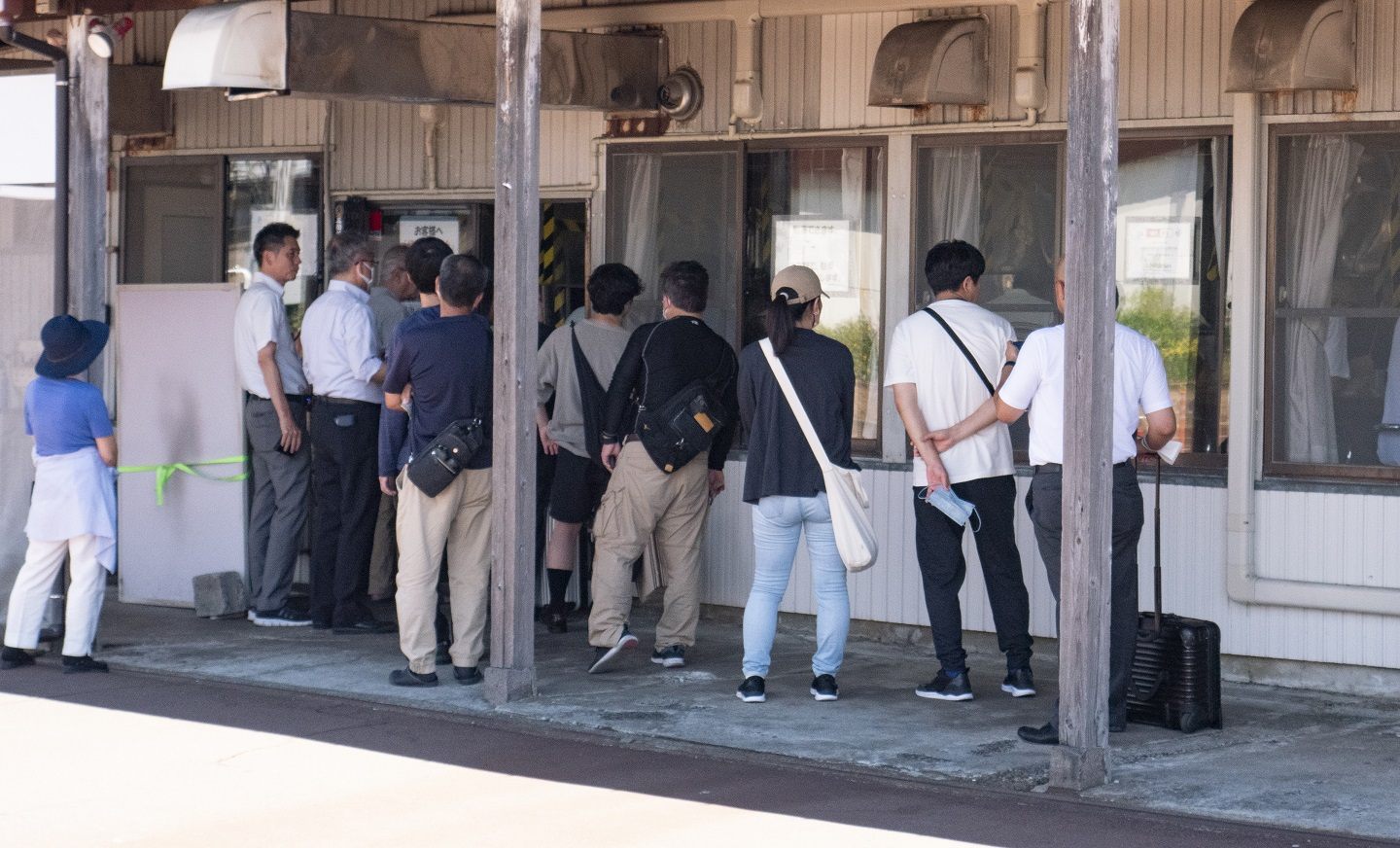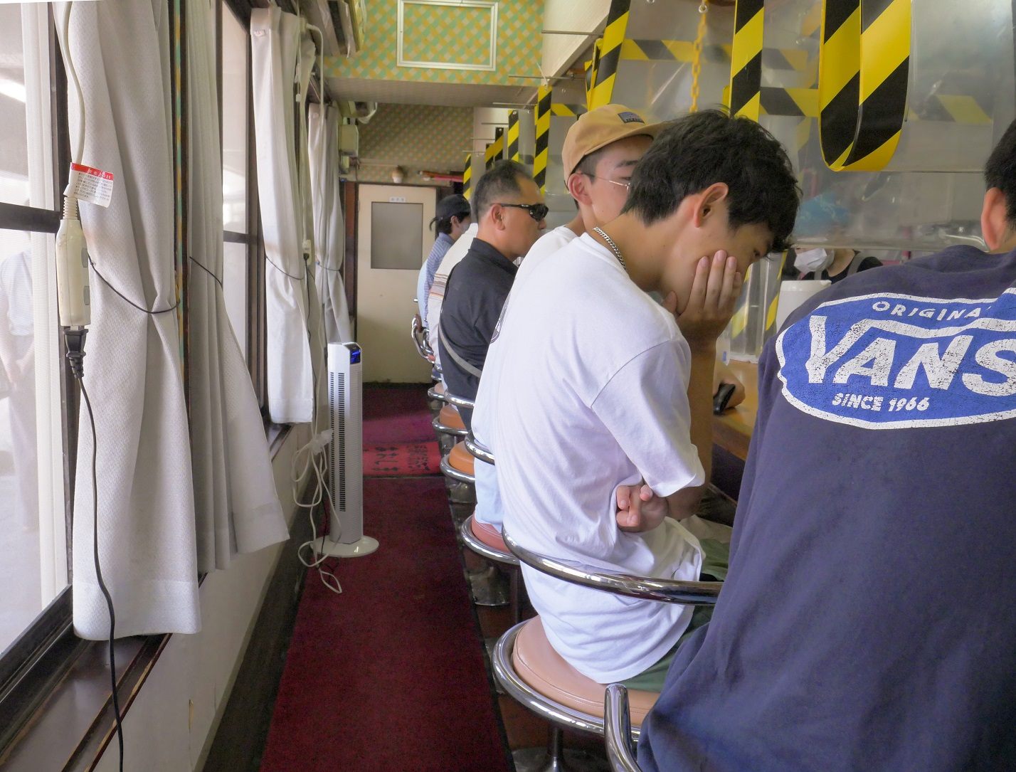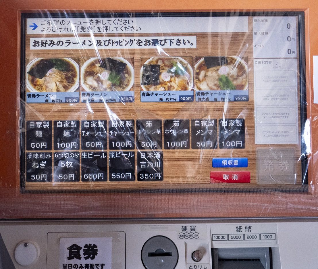 青島食堂の創業は1961(昭和36)年ごろ。宮内駅前店は昭和の“駅前食堂”的な店構え。一階部分を囲っている庇みたいな屋根は「雁木(がんぎ)」というもので、豪雪地長岡らしく冬場の歩行者の通路を確保するためのものです。午前11時の開店を待つお客さんがその下に並んでいます。日差しを遮ってくれるので、酷暑の日にも雁木はありがたいです。昭和を感じる店構えですが、注文は自動販売機で食券を買う現代風スタイルです。私は「青島ラーメン大盛り」(850円)を購入。細長いカウンターだけの店内はあっという間にお客さんでいっぱいになりました。コロナ禍の時の、黄色と黒に縁どられたパーテーションがどことなくロックな感じを醸し出しています。