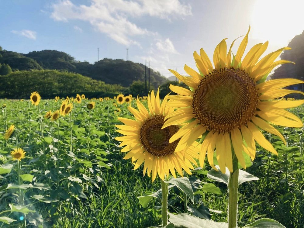 今回ご紹介した「ひまわり畑」と「弓ヶ浜」は車で5~10分ほどの距離。徒歩ですと、30分くらい。