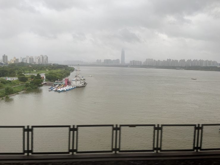 上の写真は翌日11日朝の漢江の様子です(通勤中の電車内で撮影)。大雨で水が溢れそうになっていました。真ん中のタワーはロッテワールドタワーですが、雲で半分しか見えません。