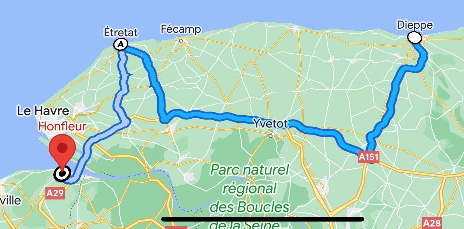 さて、前回はフェリーでイギリスのニューヘイブンからフランスのDieppe(ディエップ)までの快適なフェリーの旅をご紹介しました。2日目はディエップでレンタカーを借りて、フランス人の友人のおすすめのEtretat(エトルタ)でランチと海岸の景色を楽しみ、宿泊予定のHonfleur(オンフルール)へと向かいます。ドライブ時間はディエップからエトルタが1時間半ほど、そしてエトルタからオンフルールが1時間弱といったところです。
