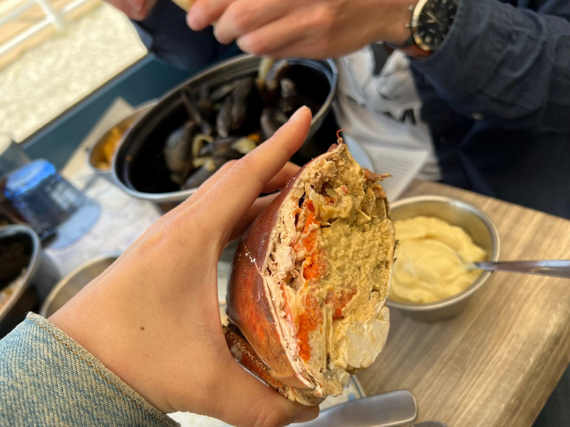 さて、昼時に到着したのでまずはピチピチのエトルタ・シーフードを!ということで、ビーチに面したLe Hormard Bleu(ル・オマール・ブルー)というレストランに入ってみました。レストランの中からもばっちり海が見えて旅行気分は最高潮です。どの魚介にするか選びきれなかったので、沢山の種類が入ったシーフード・プレート39ユーロ(一人前をシェア、写真は冒頭を参照)、ムール貝&フリット15.9ユーロと揚げたカマンベールチーズを注文しました。ムール貝はフライドポテトと一緒に提供されるのでかなりのボリュームです。そしてシーフード・プレートが1人前なのに大きい!カニとエビが特に美味しかったです。ご覧ください、カニはハーフサイズですが身がぎっしり!フレンチ・マヨネーズをつけていただきます。イギリスと同じ海を共有しているはずなのにどうしてフランス側ではこんなにシーフードが美味しくて安いのか、本当に謎です。アップルサイダーのシードルはワインほどアルコール度数が高くないので、ランチ時のお供にぴったり。食べ終わった後は腹ごなしに目の前のビーチでちょっぴりお昼寝しました。天国。
