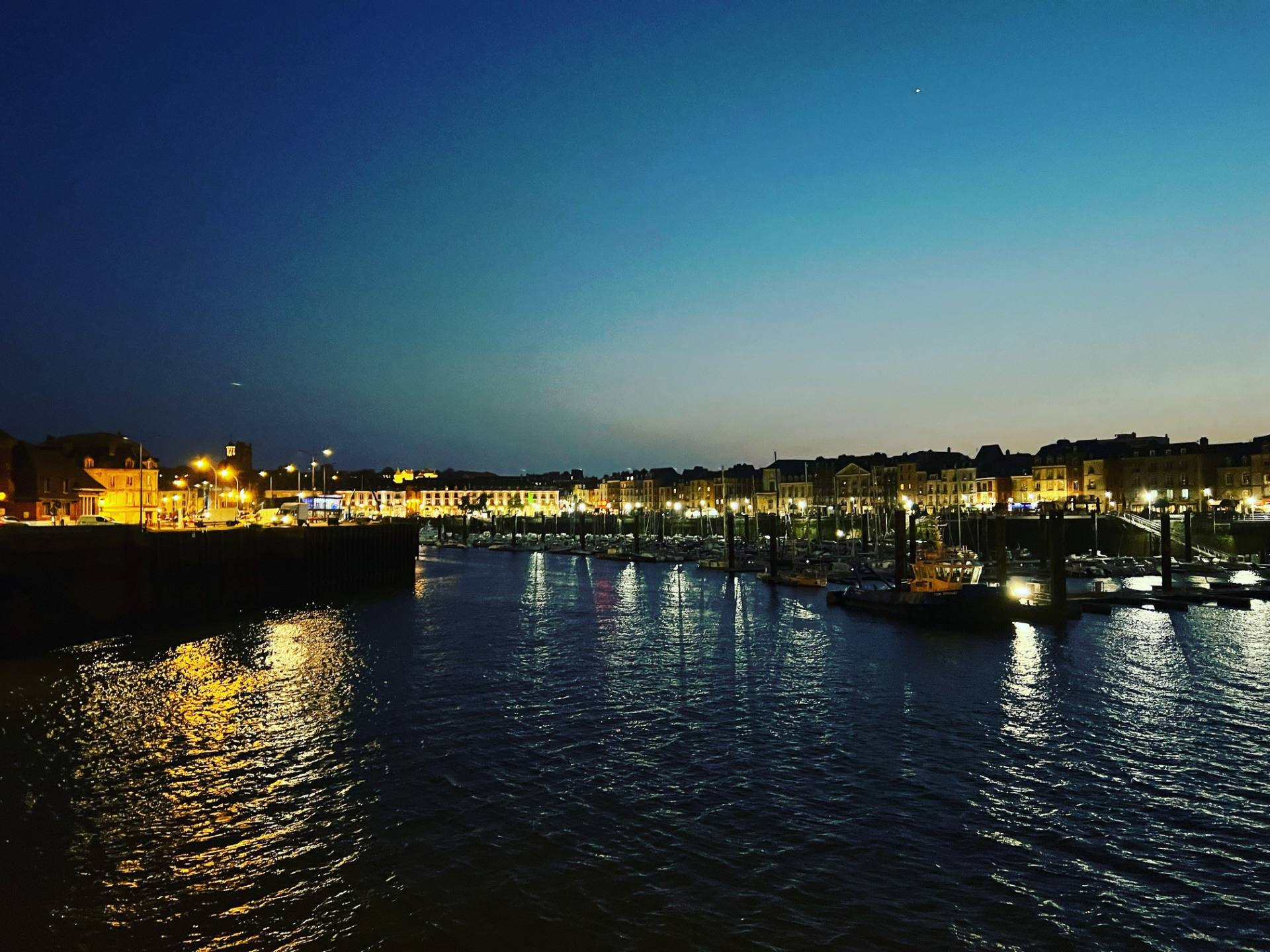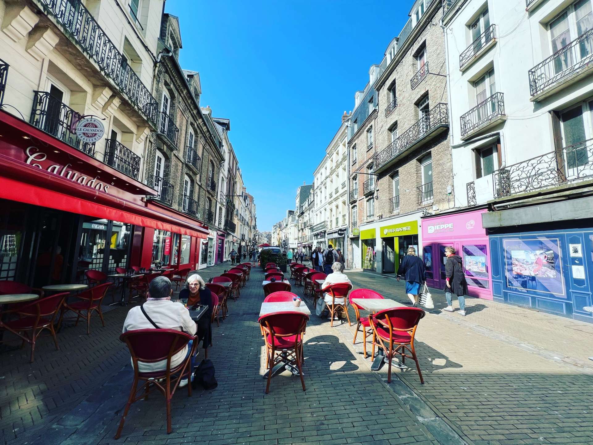 前回お伝えした通り、フェリーでフランスのディエップに到着したのは夜10時(町中についたのは夜11時前)だったので、食事はできませんでした。翌日もカフェで朝食を食べたあと少し町を歩いて、すぐにレンタカーで出発してしまったのでディエップ滞在時間は限られていました。正直、見どころがたくさんあるわけではなさそうな小さな町でしたが、ひっそりとした港の夕景はノスタルジックでした。また、メインストリートに思い切り飛び出したオープンカフェなどを見ていると、ちょっと海を渡っただけの感覚だけど、ここは確実にもうイギリスではないのだなぁ、と感慨深かったです。