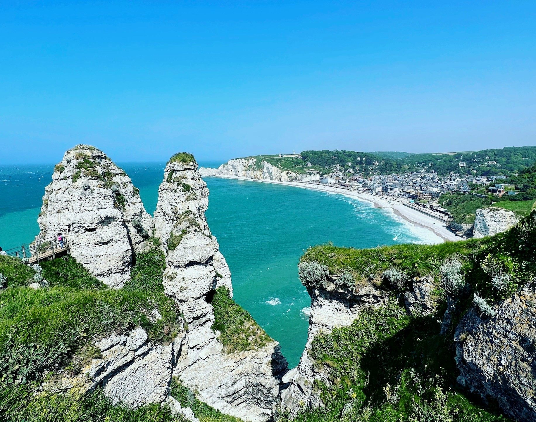 さて、ビーチで少しまどろんだ後は少し散歩してみます。せっかくエトルタに来たので、高いところに登ってみましょう。街から海を見て右側にはChapelle Nortre-Dame-de-la-Gardeという教会が丘の上に立っており、右側は前述したThe Porte d'Avalというランドマーク的な崖があります。どちらも見晴らしがよさそうですが、筆者は左側の崖を登りました。かなりの高さに見えますが、実際に登ってみるとそこまで大変ではありません。10分くらいで景色のいい崖の上に到着しました。ここでゆっくりしてもいいですし、崖の上は平坦で歩きやすいので、次の崖まで、という感じで歩き続けて新しい景色を発見するのも楽しいです。どこまでも続くターコイズ色の海と真っ白な不思議な岩というエトルタならではの眺めを目に焼き付けましょう。