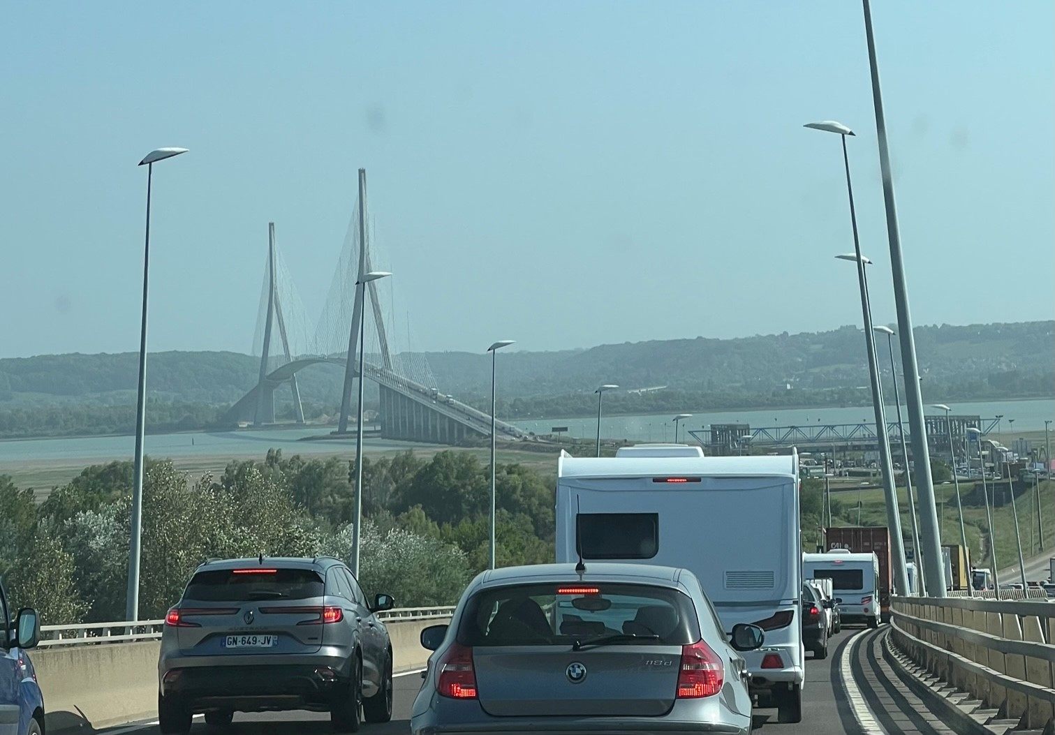散歩を終え、お土産も購入したのでそろそろ本日の最終目的地のHonfleur(オンフルール)に向かいます。ドライブ中に注目したいポイントがPont de Normandie(ノルマンディー橋)。この橋はセーヌ川をまたいだLe Havre(ル・アーヴル)とHonfleur(オンフルール)をつないでいる全長2.14キロの橋で、この種類の橋ではヨーロッパで最長だそうです。海かと思いきや、実は橋がつないでいるのはセーヌ川なのですね。パリを流れているあのセーヌ川がノルマンディーまで来て、ここから海に出るのです。知らなかった…。渡るときにちょっとワクワクする、大迫力の橋です。フランスの500ユーロ札(普通に生活していると見ることはないですが)のデザインにはこの橋が使用されているそうです。