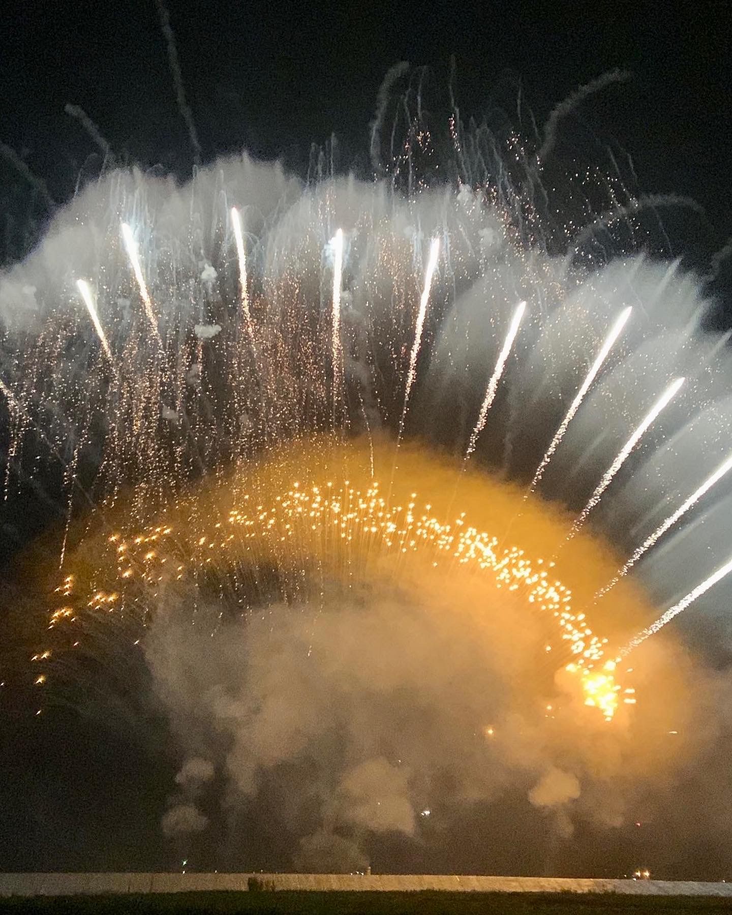 フィナーレの打ち上げ花火です。ブルーインパルスが大空にカラースモークで描くような花火です。