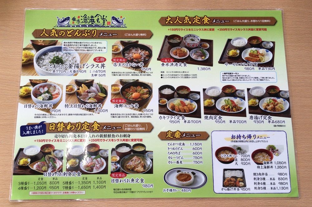 メニューは、新鮮な魚をたっぷり使用した丼と定食、うどんやそばなどの麺料理があります。筆者が注文したのは一番人気の垂水漁港定食(1380円)。母は7種盛り定食(1650円)を注文しました。