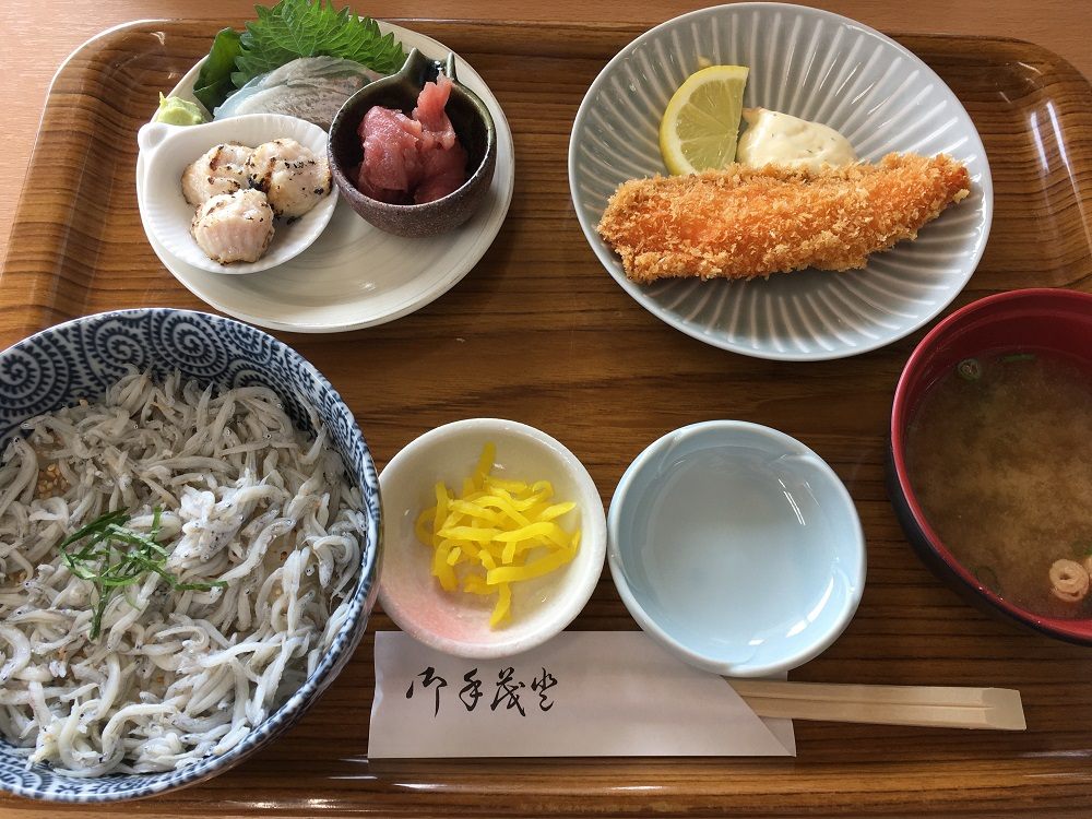 垂水漁港定食はたっぷりのシラスがのったシラスご飯とお刺身(この日は焼鱧、マグロのなかおち、ヒラメ)、サーモンのフライ、みそ汁、漬物とボリューム満点の内容です。シラスはスーパーで見るものより一匹一匹が大きいのですが、口の中で残らずフワフワの食感を楽しむことができます。筆者も初めて食べた須磨サーモンのフライはあっさりしていてとても食べやすかったです。揚げたてザクザクをほおばりました。