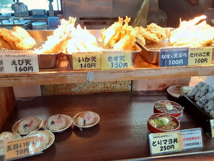 店内に参ると目の前に並ぶおいしい誘惑たちとご対面!! うどんは、(大)(中)(小)と量を選ぶことができるのでお腹と相談しながら食べたいものをチョイスするといいかも。