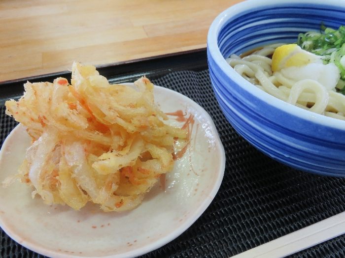 おいしい誘惑に負けたけど、小エビ入りのかき揚げサックサクでボリューム満点で満足!! また、ぶっかけうどんは甘辛い出汁にからまった麺をすするたびに味わいが口のなかいっぱいに広がって食欲が増し、薬味や大根おろしで後味スッキリ♪