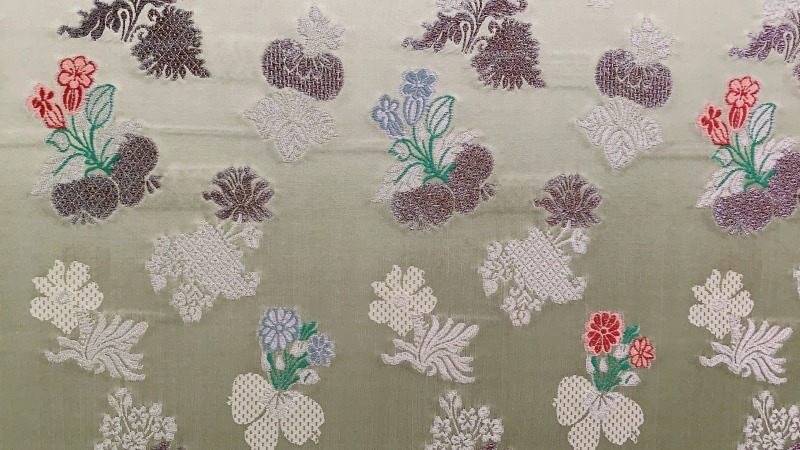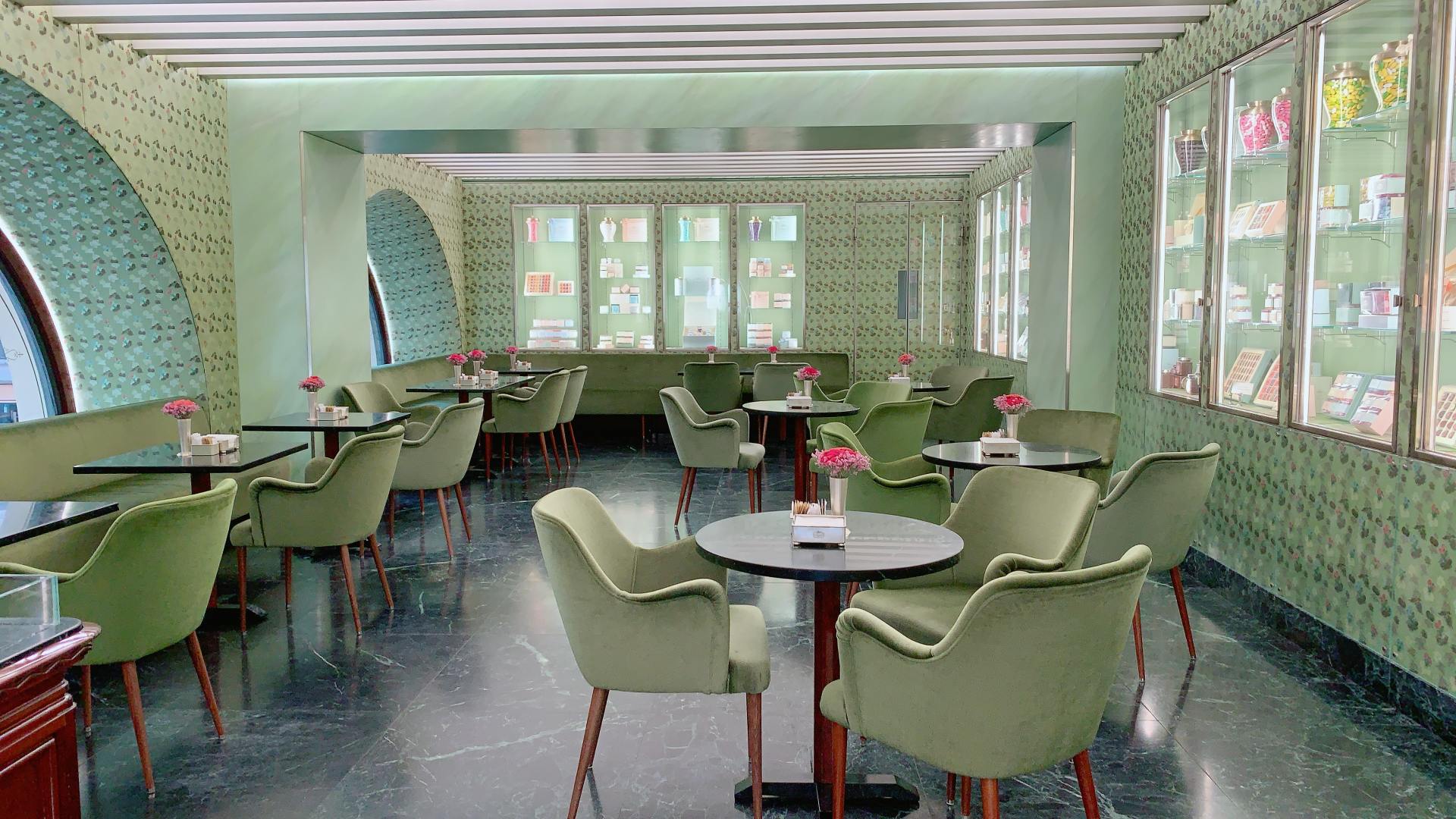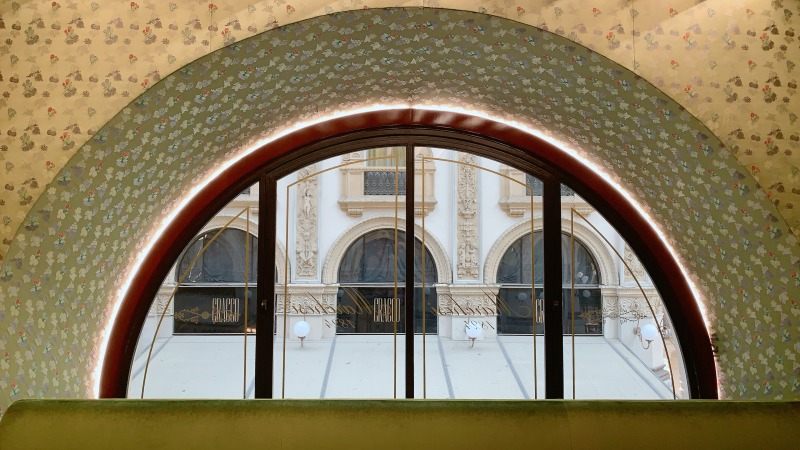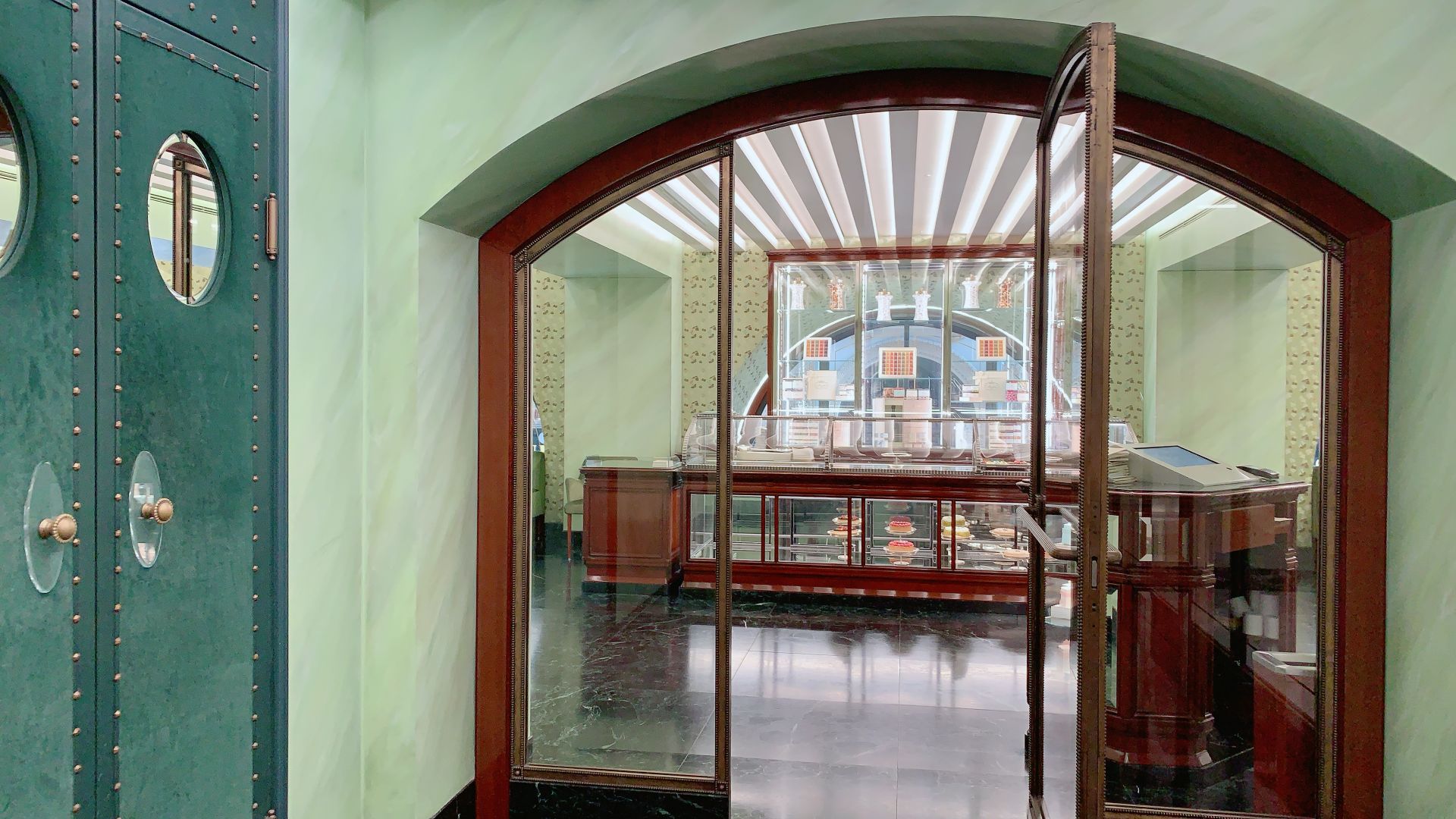 半円の窓や木製のショーケース、刺繍の壁紙、グリーンで統一されたインテリアなど