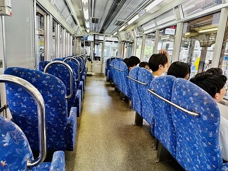 優先座席には茶系のヘッドレストがあり、直上の吊手が長くなり、容易に識別できるようになっています。八瀬比叡山口駅方のドア付近のいすは折り畳み式で、車いす・ベビーカースペースとすることができ、バリアフリーにも対応。