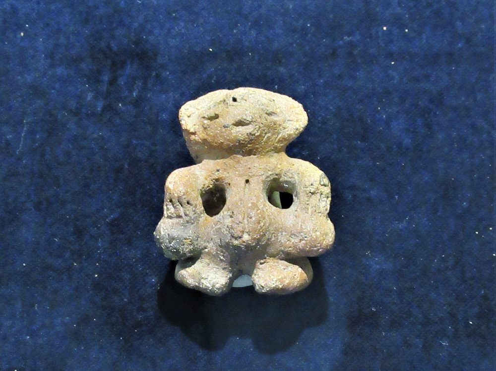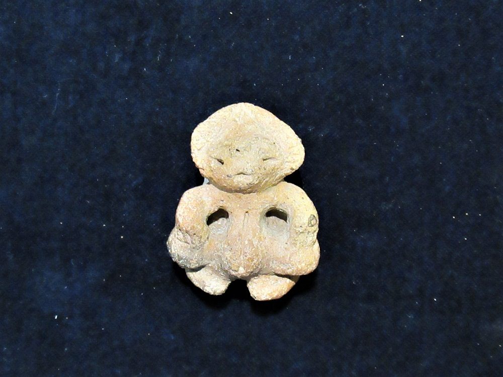 こちらは、「花上寺(かじょうじ)遺跡」で出土した縄文時代後期の「超小型土偶」。なんと身長4㎝です。小型土偶のなかでも、目、口、鼻、手指、お腹の正中線など、細部がしっかり表現されていると評判なんですよ。可愛いですね。
